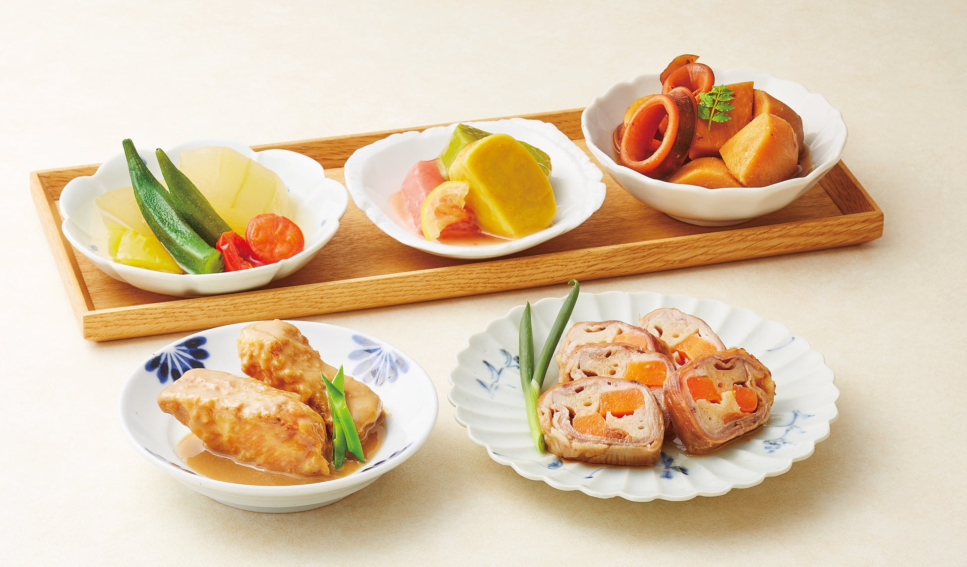 高校生が“夏にもらったら嬉しい惣菜(主菜)” として考案した「松阪豚の梅市松巻き」と「伊勢まだいの胡麻出汁」に<まつおか>夏惣菜(副菜)を詰め合わせたセット。