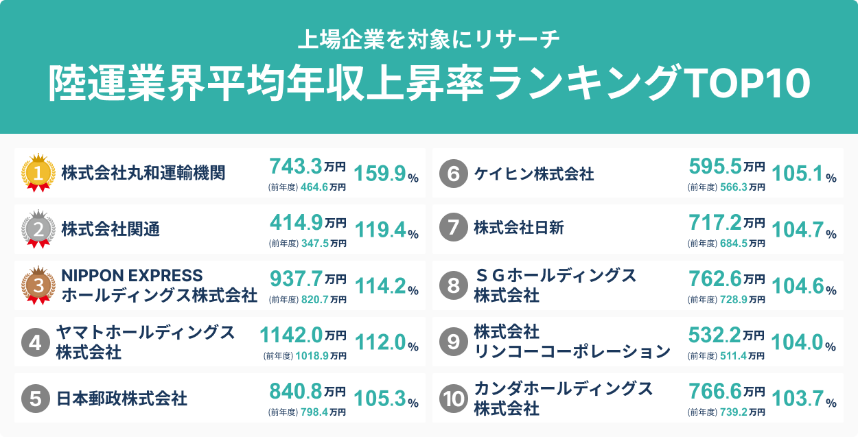 陸運業界、平均年収上昇率ランキングTOP10を発表!/SalesNow DBレポート