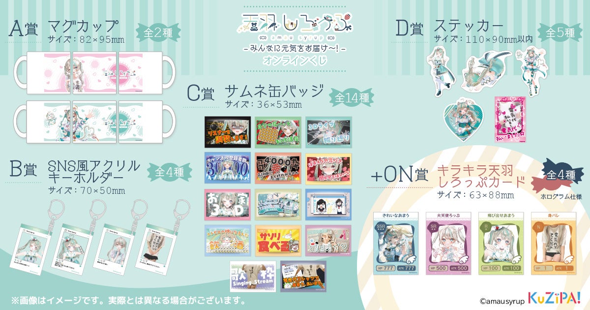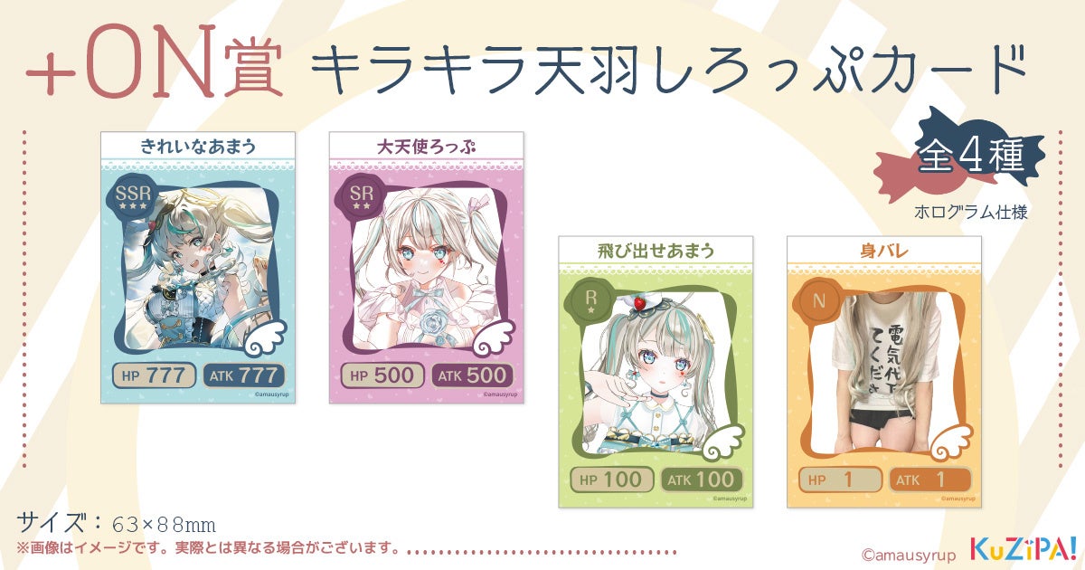 昨年12月に実施した大好評の第1弾に引き続き、顔以外は身バレしているVTuber「天羽しろっぷ」のオンラインくじ第2弾です。今回はマグカップ・アクリルキーホルダー・缶バッジ・ステッカーの4賞をご用意しています。複数ある絵柄の中には実写グッズもあり、「身バレ系」の異名にふさわしいラインナップとなっています。くじを引くごとに自動抽選にて限定景品ゲットのチャンスがある「+ON賞」では、トレーディングカード風「キラキラ天羽しろっぷカード」が当たります。