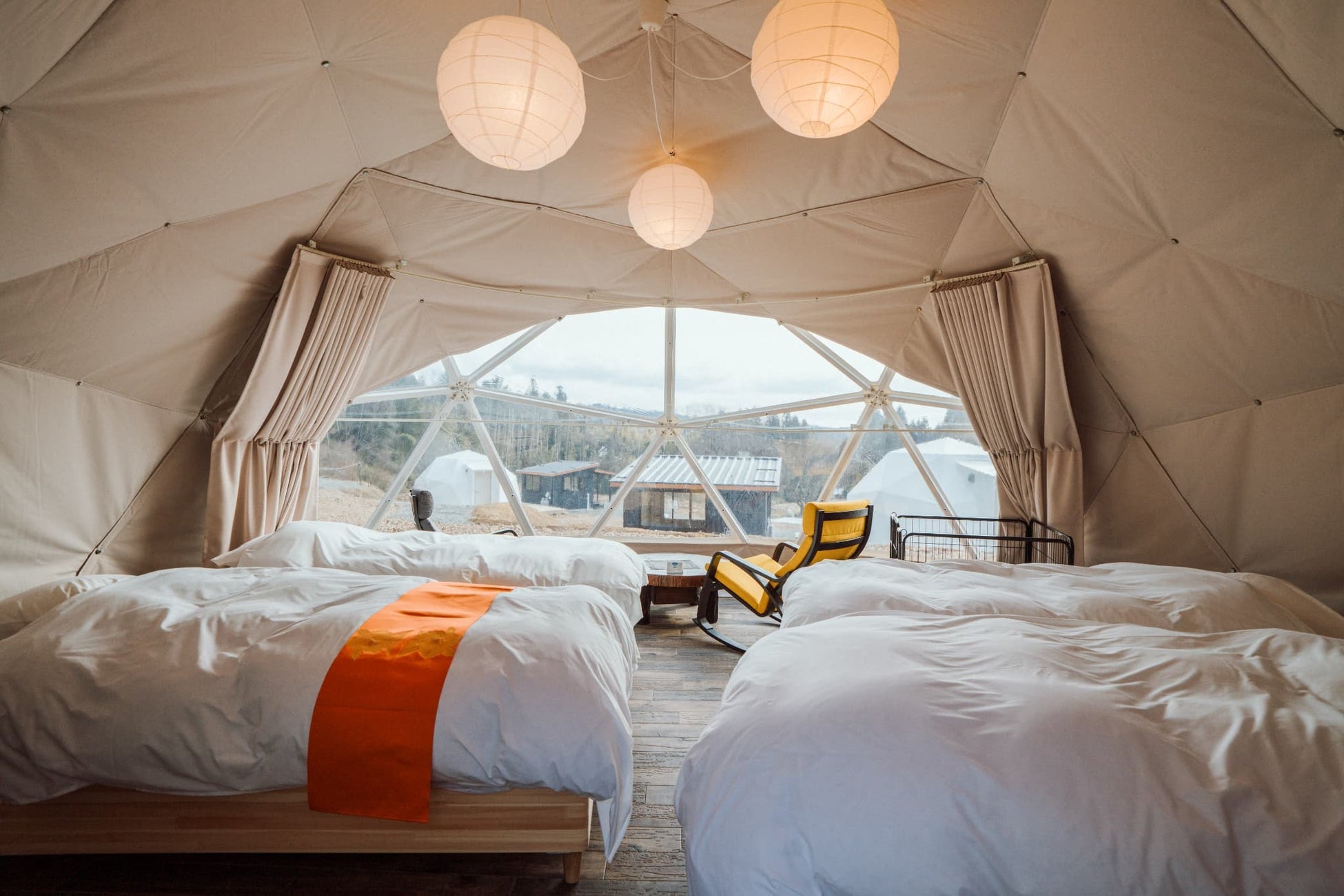 グランピングドーム | シングルベッド4台 | 2~5名 | 9,000円~/人(4名利用時) |