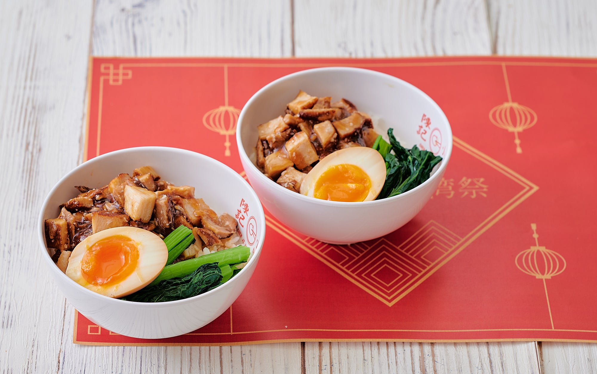 (左)甘辛醤油ベースのタレで煮込んだ小さく切った豚肉をホカホカのご飯にかけた、台湾のソウルフードともいわれる「魯肉飯(ルーローハン)」。(右)豚ひき肉とニラをたっぷりと加えた、旨味とコクのある台湾風ラーメン。