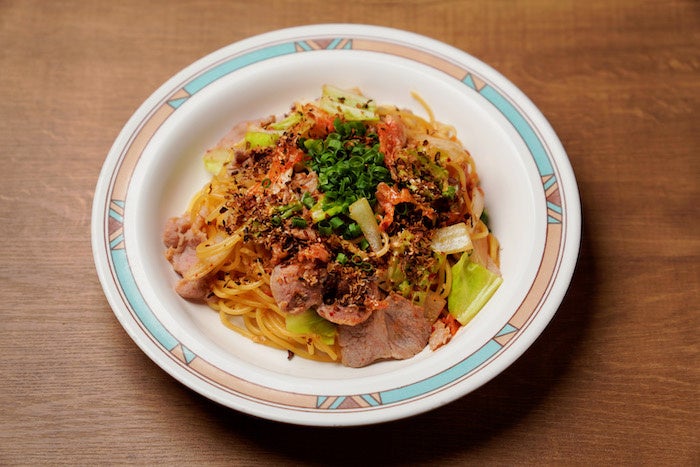豚肉とキムチを炒めたピリ辛のパスタに、「タマネギぐるりこ」をトッピング。スパイシーな味わいの中に、たまねぎの旨味が広がります。