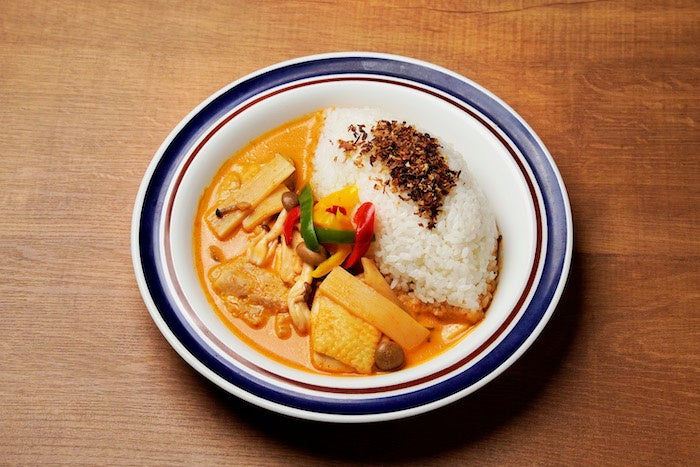 ココナッツミルクとレッドカレーペーストを合わせた本格派レッドカレー。タマネギの旨味を凝縮した「タマネギぐるりこ」とともに、たっぷりの野菜とお肉を楽しめます
