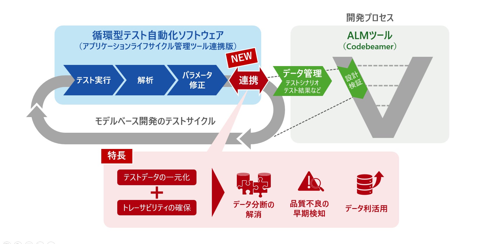 SDV化が進む中、車載ソフトウェア開発では、テストサイクルと開発プロセスのデータが別々に管理されてしまうことによるデータの分断が品質確保と効率化の課題となっています。今回の連携版では、循環型テスト自動化ソフトウェアとCodebeamerをつなぎ、シミュレーションテストの検証結果をCodebeamerへ自動的に反映することで、データ分断を解消し、テスト仕様書から結果までのデータの一元化とトレーサビリティの確保を実現します。過去の検証結果の利活用と、進捗および問題発生をリアルタイムで監視することにより、品質不良の早期検知と開発効率化の両立が可能となります。