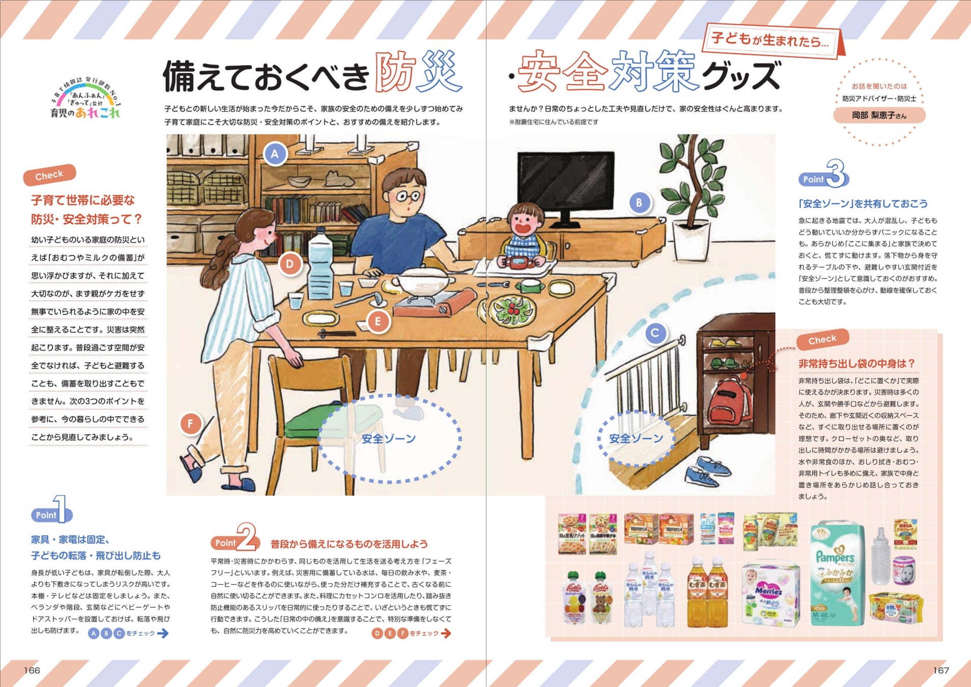 家族の安全を守るために必要な防災・安全対策について、防災アドバイザー監修のもと、子育て家庭向けのポイントやおすすめの備えをイラストで分かりやすく紹介。非常持ち出し袋の中身についても、カタログ掲載商品とあわせて解説しています。
