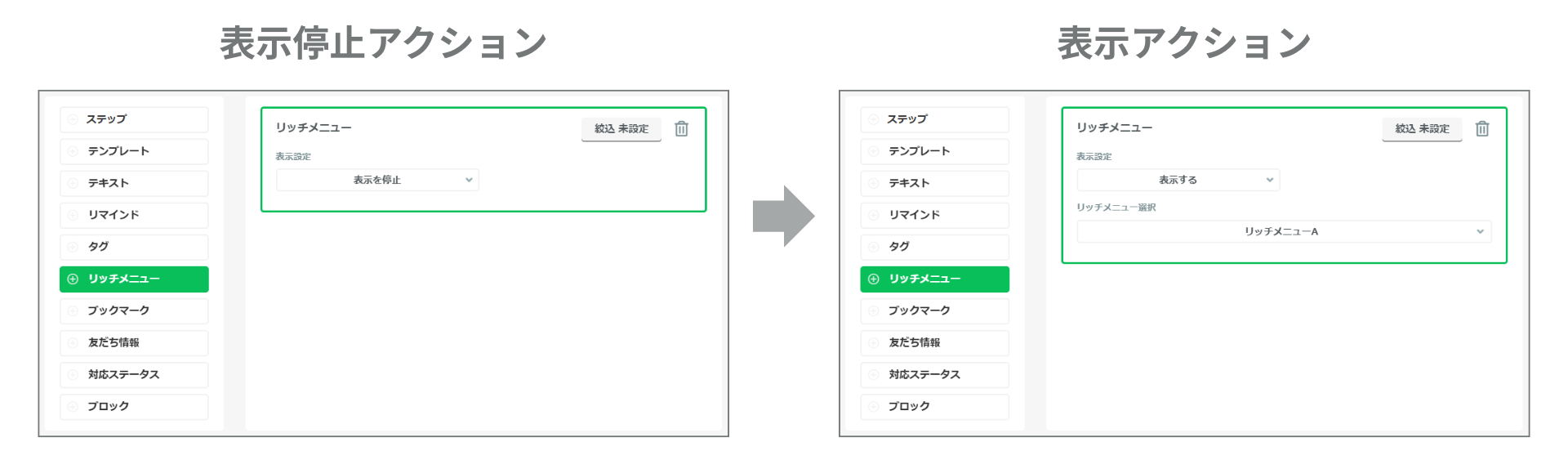 なお、「表示停止」後に特定のリッチメニューを自動で表示させたい場合は、「表示停止」アクションを削除し、表示したいリッチメニューの「表示」アクションを設定することで対応できます。