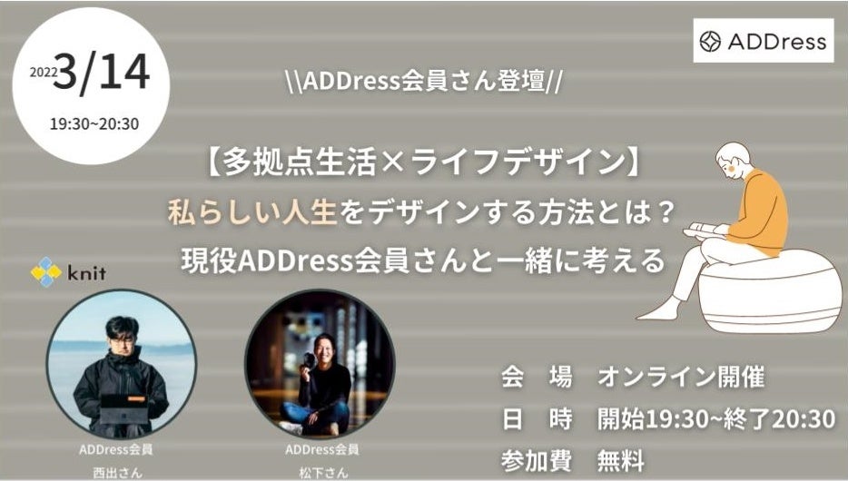 オンラインアウトソーシングサービス「HELP YOU(ヘルプユー)」を運営する株式会社ニット(本社:東京都品川区、代表取締役社長:秋沢崇夫、以下ニット)は、2015年にフルリモート前提で創業し、現在、約400人が日本全国・世界33カ国からオンラインで業務を遂行しています。このたび、令和4年3月14日(月)に開催される【多拠点生活×ライフデザイン】私らしい人生をデザインする方法をADDress会員さんと考える対談イベントに、当社の広報チーム / コミュニティマネージャーである西出が登壇します。西出はADDressを活用しながら、アドレスホッパーとしてこれまで全国65拠点以上で多拠点生活・ワーケーションをしながらの生活を実践。当日は、簡単なサービス紹介の後に、ADDress会員さんや家守さん等を交えながらのトークセッションを行います。