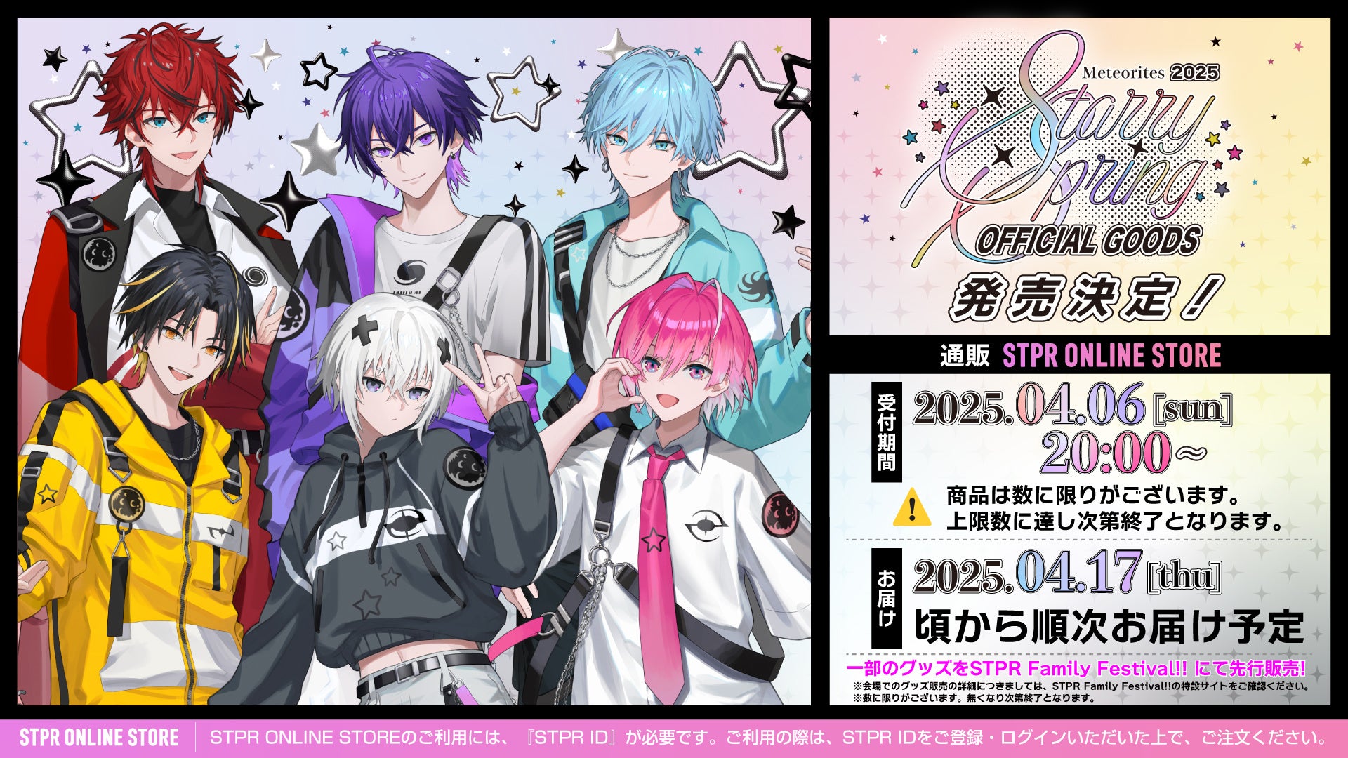 株式会社STPR (本社:東京都渋谷区 代表:柏原 真人、以下STPR)は、所属の2.5次元歌い手アイドルグループ“めておら - Meteorites -”の春グッズ「めておら - Meteorites - 2025 Starry Spring OFFICIAL GOODS」について、4/6(日)20:00よりSTPR ONLINE STOREにて通販受付を開始することをお知らせいたします。