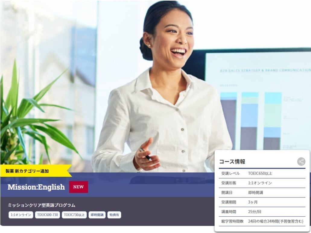 株式会社Aoba-BBT(本社:東京都千代田区、代表取締役:柴田巌)は、ビジネスで相手を動かす英語コミュニケーション力を育成する1対1オンラインプログラム「Mission:English」において、製薬業界に特化した新教材(Sales & Marketing編/R&D編)を開発・リリースいたしました。