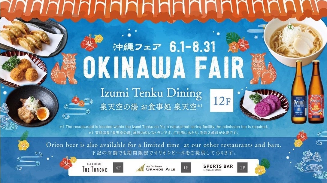・オリオンビール各種の販売(1F オールデイダイニング グランドエール|1F SPORTS BAR by VILLA FONTAINE|4F バー&ラウンジ ザ・スローン|12F お食事処 泉天空※「お食事処 泉天空」をご利用の際は、「泉天空の湯」への入館手続きが必要です。)