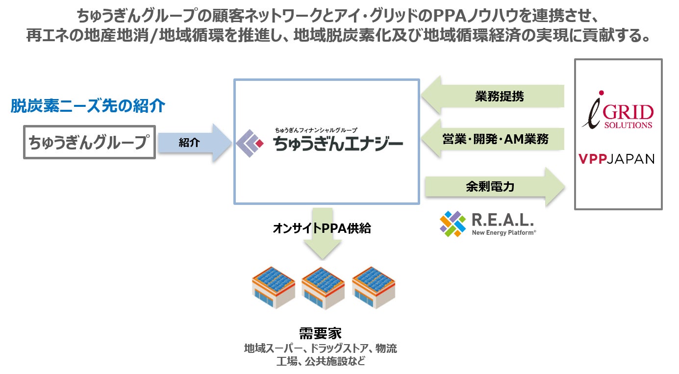 今回の提携では、アイ・グリッドのPPAノウハウとちゅうぎんグループの顧客ネットワークを連携させ、太陽光PPA事業を共同でおこないながら地域脱炭素の取組みを加速させていくことを目的としています。両社のシナジー効果によって再エネを創出し、それらを循環させることで、地域カーボンニュートラルを実現することを目指してまいります。こうした取組みを通じ、地域の連携で生み出す再エネを蓄電池・EVや施設間シェアで巡らせる「エネルギーの地産地消」を促進し、安心して暮らせるまちづくりの実現を目指します。