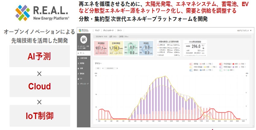 独自開発のエネルギーマネジメントプラットフォーム「R.E.A.L. New Energy Platform®」を活用することで太陽光パネルの設置面積を最大化し、再エネ電力の自家消費比率を大幅に向上させる「余剰電力循環モデル」を構築するなど、テクノロジーを活用した独自のソリューションや技術/ノウハウを蓄積しており、様々な連携により脱炭素社会化を推進している。