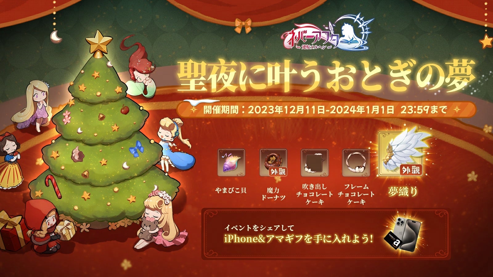 以上のポイントに加えて、公式X(旧Twitter)アカウントにてシェアイベント「クリスマスパーティー」が絶賛開催中です。フレンドを招待してパーティーに参加すると、参加人数によって限定外観とフレームを獲得できます。さらに、5人到達でずっと使える背飾り外観「夢織り」も獲得できます。X(旧Twitter)でハッシュタグ #ネバアフ を検索して、ほかの冒険者の一行に参加し、みんなでクリスマスプレゼントをゲットしましょう!この冬は、おとぎの世界で一緒に過ごそ?