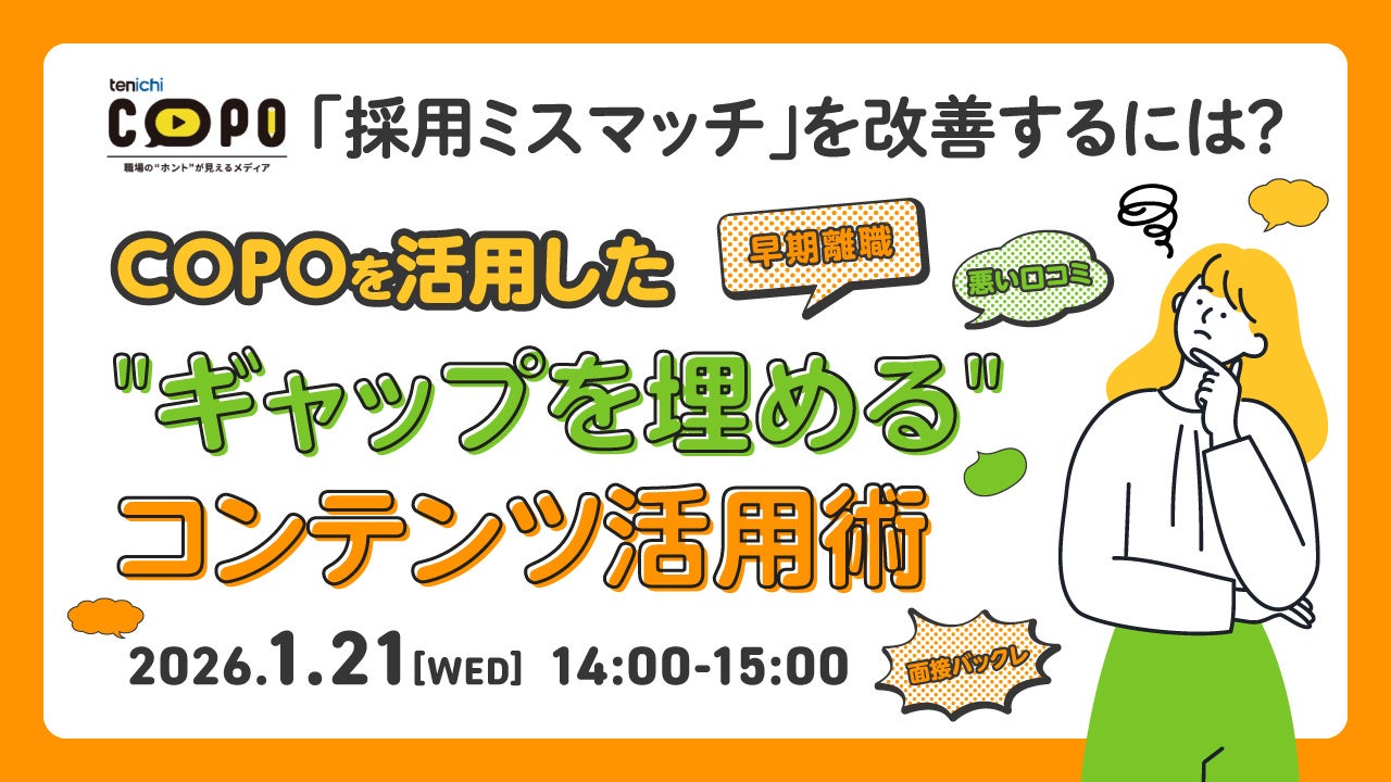 「働く」に関する社会課題をビジネスで解決するキャムコムグループの株式会社天職市場(以下天職市場、本社:東京都新宿区、代表取締役:春名敬太)は、2026年1月21日(水) 14:00よりオンラインセミナー「「採用ミスマッチ」を改善するには?COPOを活用した”ギャップを埋める” コンテンツ活用術」を開催いたします。
