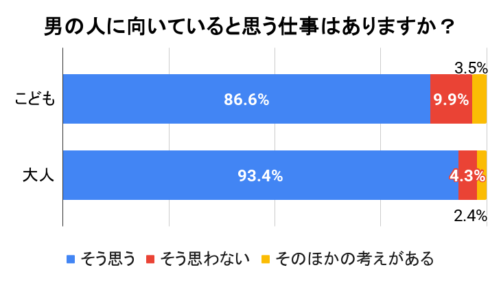 「女の人に向いていると思う仕事はありますか?」の設問で「そう思う」と答えたこどもは大人より5.6ポイント少なく、「男の人に向いていると思う仕事はありますか?」の設問においても、こどもは大人を6.8ポイント下回る結果となりました。