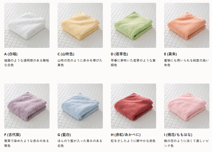 日本の伝統色をイメージしたやさしく落ち着いた色合いで、グラデーションも美しい豊富なカラー展開です。用途やご家族で色分けして使うのもおすすめです。