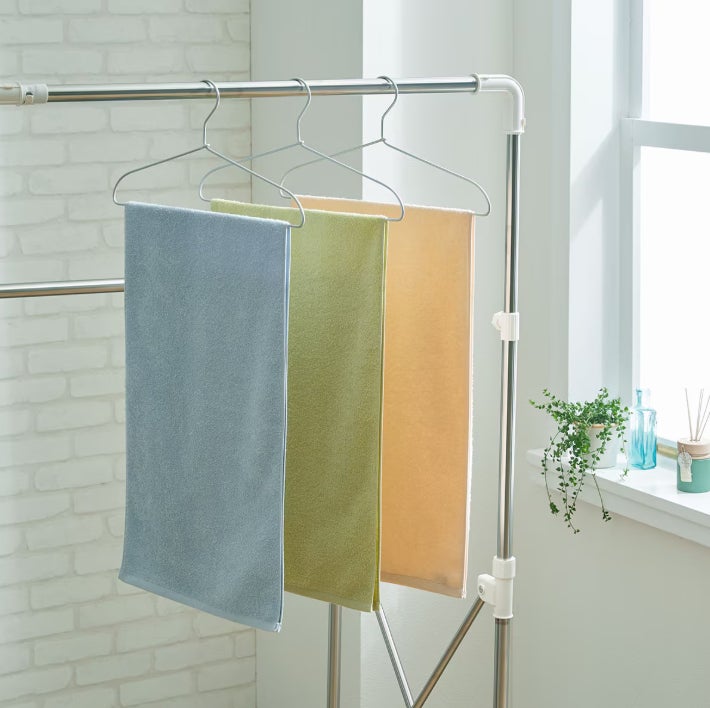 幅はフェイスタオル、長さはバスタオルと同じ。バスタオルよりも省スペースで干せて、収納スペースも取りません。女性やお子様なら、ハンガーバスタオルで充分にふき取れます。