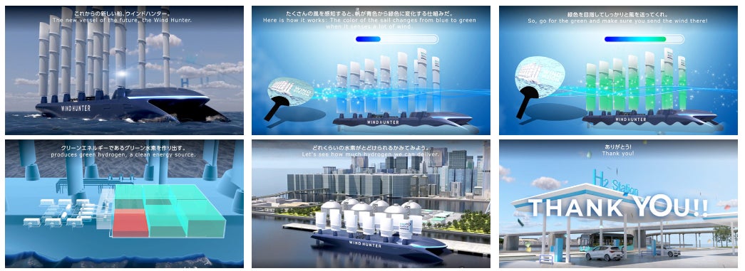 体験型アトラクションである“wind vision attraction”は、 長さ約4m・高さ約3mのウインドハンター模型に来場者がうちわで風を送ると、シミュレーション航海が始まり、水素が製造、運搬、供給されるまでの様子を背面の大型スクリーンの映像で放映します。来場者の起こす風に連動し、模型の帆が拡縮、回転するだけでなく、風量によってエンディングシーンも変わるなど、模型と映像を連動させたゲーム感覚で遊びながら学べるアトラクションです。また、体験に使用したオリジナルのうちわは来場記念のノベルティとしてお持ち帰りいただけます。