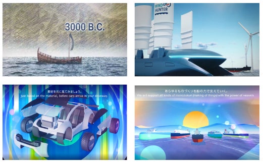 大型スクリーンで常時投影する5つの映像は、「水素社会を創る」「無限の風を活かす」「ものづくりを繋ぐ」「暮らしの価値を生む」「未来を動かす」のテーマからなり、船と社会や産業、人との関わりを表現、海運業をより身近に感じられるコンテンツです。それぞれのテーマに合わせて、アニメーション、実写、CGなどを使い分け、度々足を運びたくなる新しさとワクワク感を提供します。