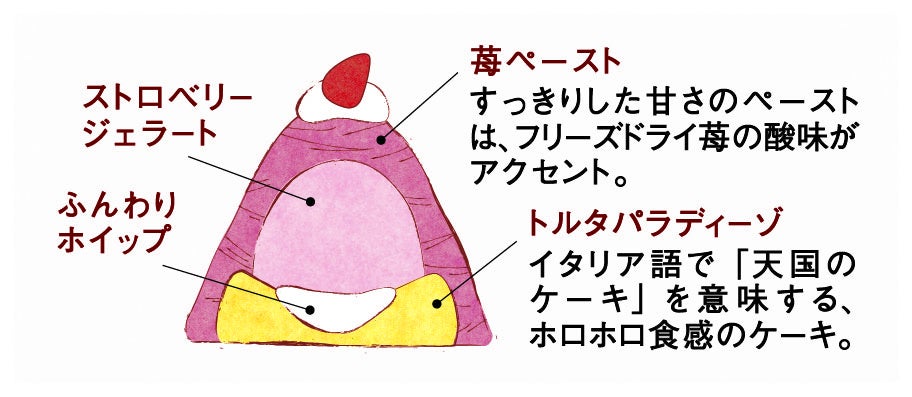 今回登場する「しぼりたて 苺のモンブラン」は、これから旬を迎える苺を使用した一品です。イタリア語で“天国のケーキ”を意味する、ほろほろ食感のケーキ“トルタパラディーゾ”に、イタリアジェラート協会認定の果肉入りストロベリージェラートをのせ、苺ペーストをたっぷりしぼりました。苺ペーストにはフリーズドライ苺の酸味をプラスし、すっきりとした甘さに仕上げています。カットした苺をはじめ、苺風味の食材、ふんわりホイップと組み合わせたドルチェで、さまざまな苺のおいしさを一度にお楽しみいただけます。ほんのり赤いモンブランや真っ赤な苺が織りなす、華やかな見た目にもご注目ください。