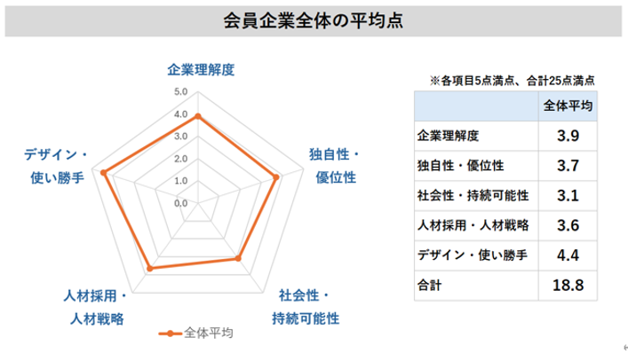 各社のホームページに対して点数化を実施し、その企業ごとの点数を集計して項目別の平均点を算出することで、会員企業全体の傾向を可視化しました。(調査実施時点でホームページを閲覧できた調査対象企業数は73社)
