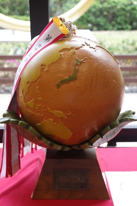 高さ60cm、幅50cm、重さ14.7kg の大きな地球儀で、開催都道府県に引き継がれています。