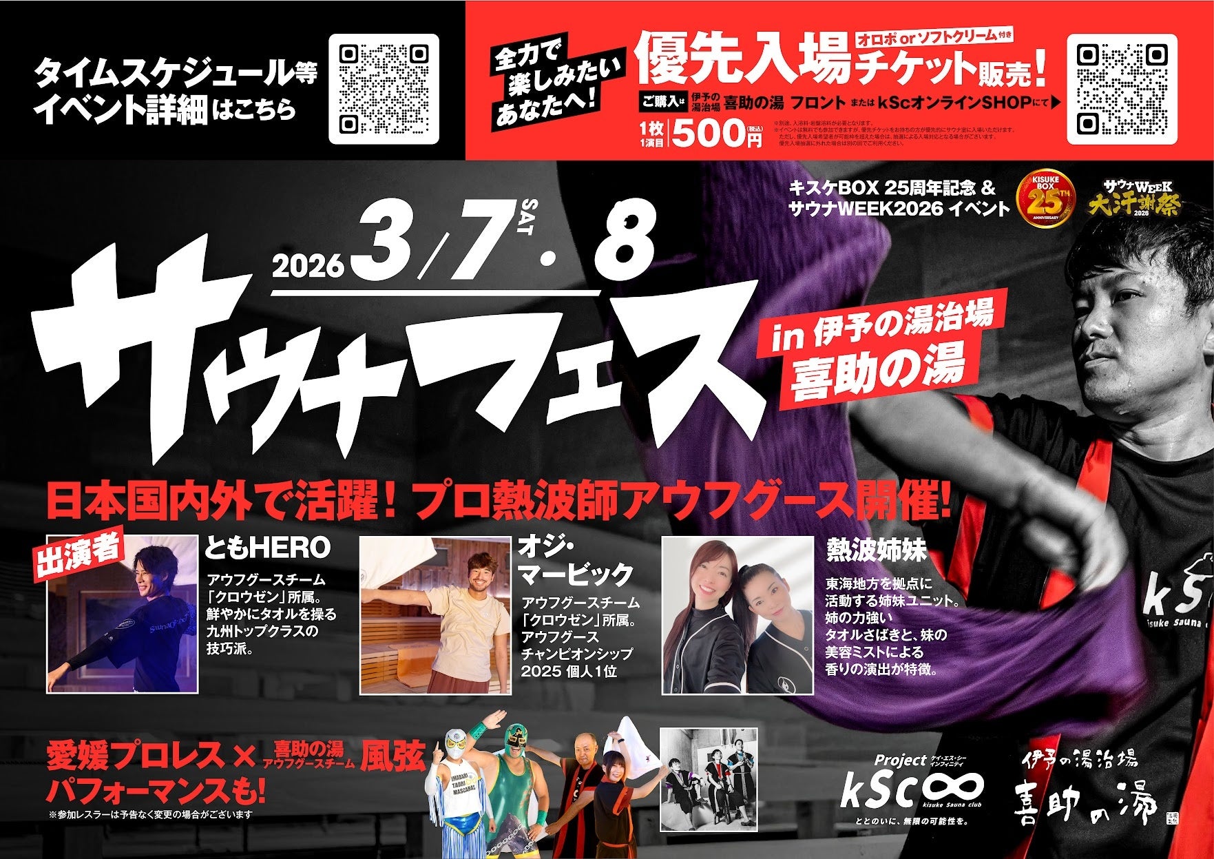 出演は、ACJ個人部門優勝の「オジ・マービック」、クロウゼン所属の「ともHERO」、姉妹ユニット「熱波姉妹」(2026年3月8日(日)のみ特別出演)、開催地・喜助の湯のキスケ熱波師チーム「風弦」、さらにkSc公式アンバサダー「愛媛プロレス」(2026年3月7日(土)のみ特別出演、出演レスラーは後日発表)を予定しています。熱波師それぞれの個性と演出が交差し、時間帯ごとにサウナ室の表情が変わる2日間になります。