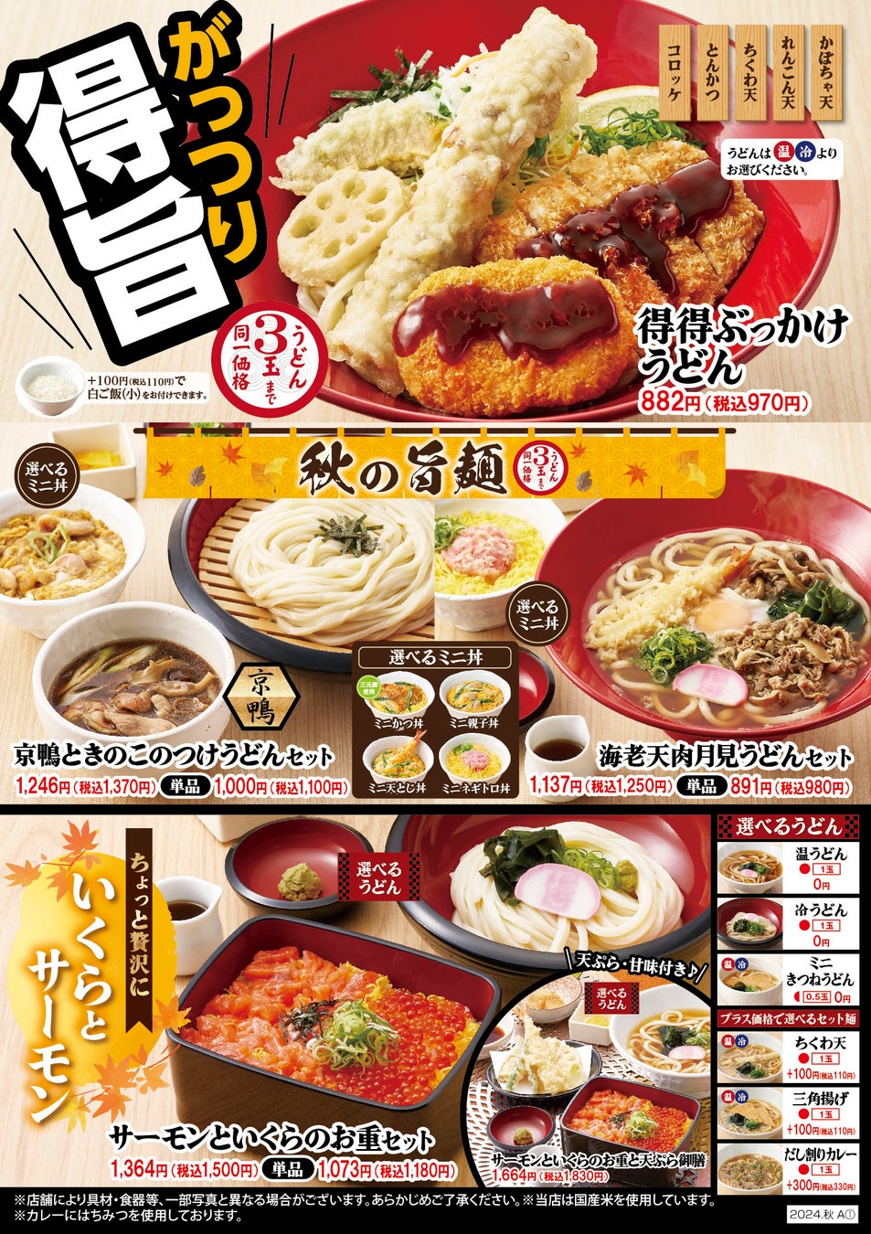 食欲の秋は得得へ!うどん3玉まで同一価格!