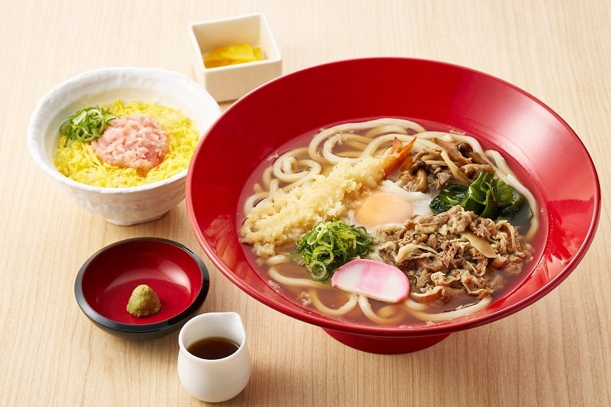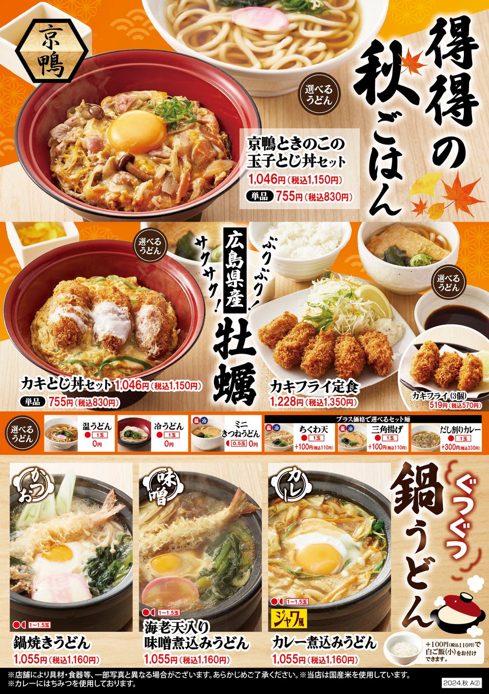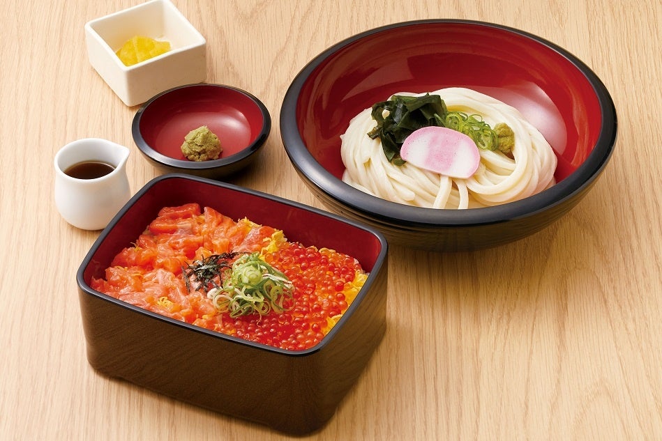 他にも、ネギと相性抜群の京鴨を使用した「京鴨ときのこのつけうどんセット」や海老天・肉・玉子がトッピングされた「海老天肉月見うどんセット」、セットのうどんが選べてボリューム満点でちょっとぜいたくな味わいの「サーモンといくらのお重セット」もおすすめです。是非、食欲の秋は得得でお得に腹ごしらえしてください♫(※一部の店舗では販売していないメニューがございます。)