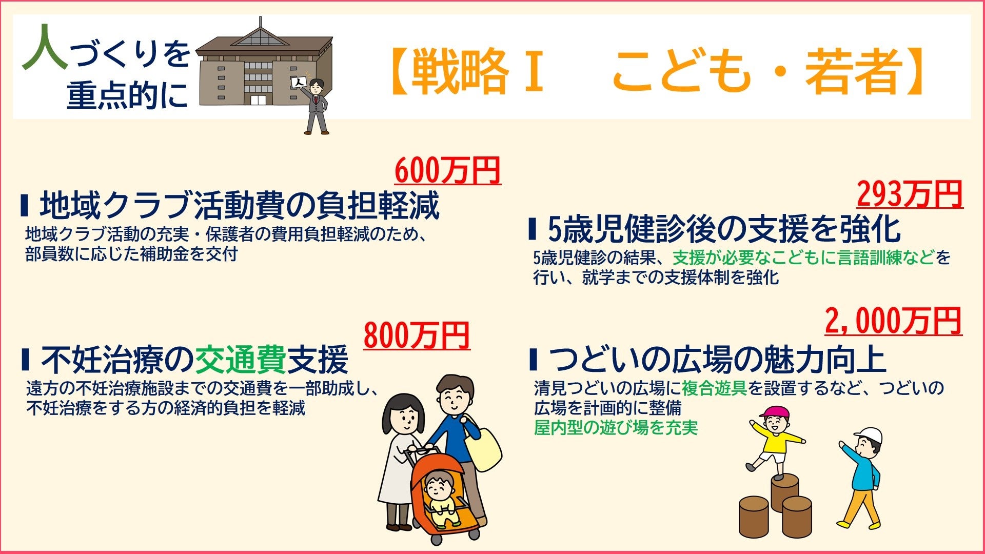 また、不妊治療で遠くまで通う方への交通費を助けたり、こどもが安心して遊べる屋内型の遊び場を整備したりして、将来を担うこどもを安心して生み育てやすい環境づくりに取り組みます。