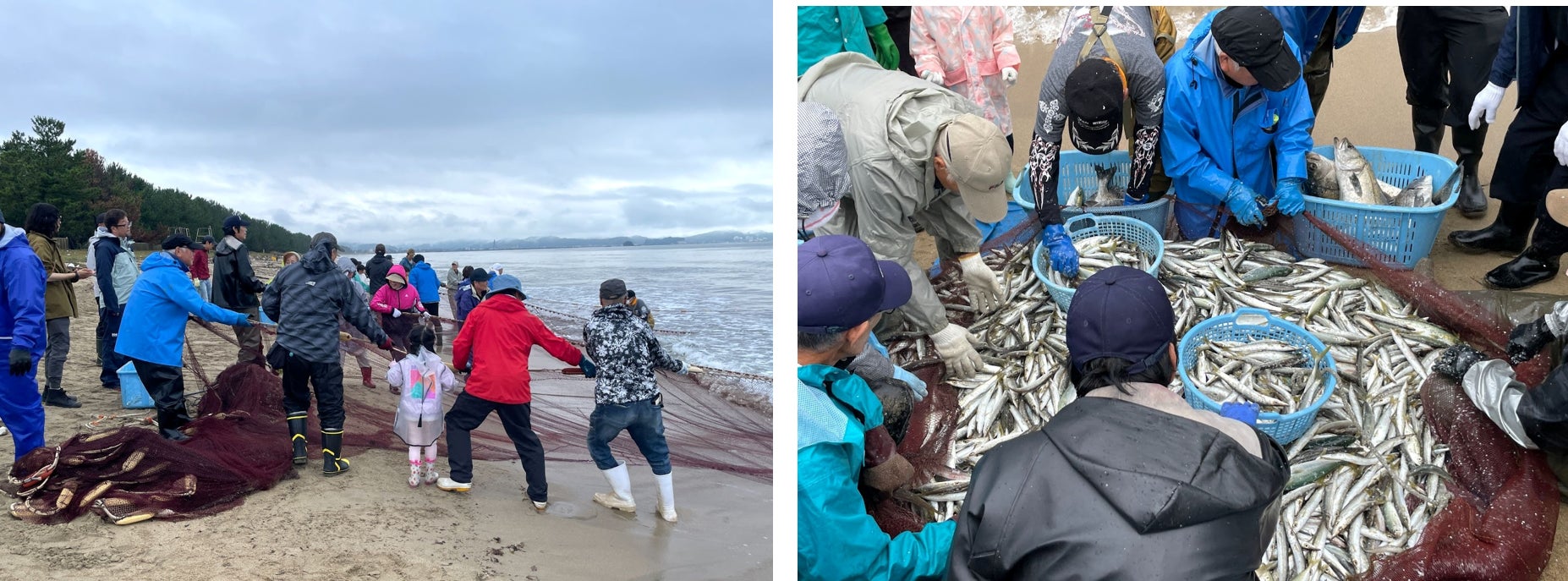 今回のイベントは、能登半島地震により住み慣れた地域を離れざるをえなくなった氷見市新道地区の住民を対象に実施されました。まずは市内の島尾海水浴場で、伝統的な地引網漁を体験。地元の漁師さんの指導のもと、子どもから大人まで力を合わせて大きな網を陸に引き上げました。この日は特に大漁で、カマス、キス、クロダイ、カワハギ、スズキ、サゴシなど、多彩な魚が次々と水揚げされました。
