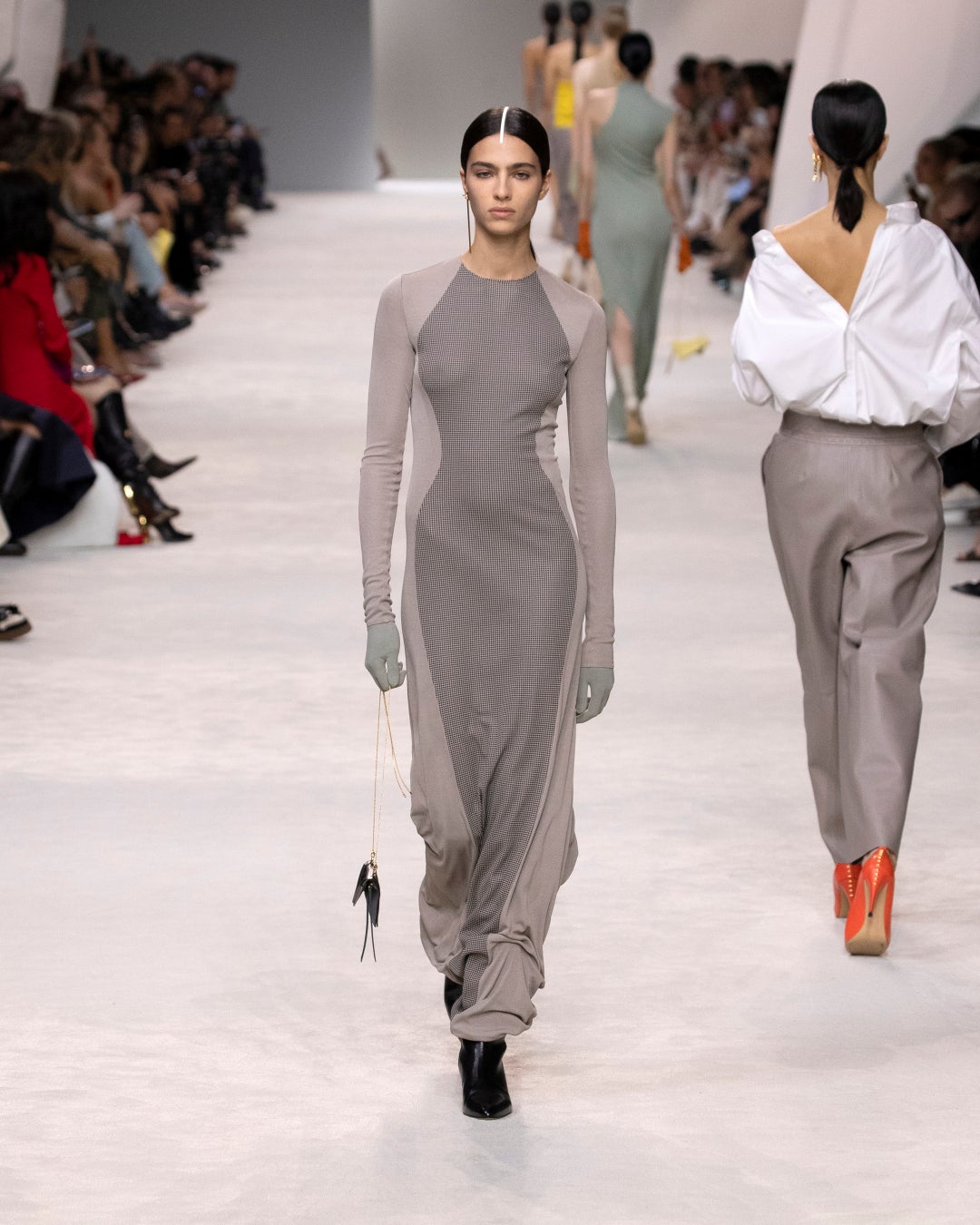 「ローマにいるときは、毎日ホテルからコロッセオまでイヤーポッドをつけて歩くのですが、まるでフェンディの架空のキャラクターが登場する、想像上の映画のサウンドトラックを聴いているようです」とキム・ジョーンズは語ります。「ローマには、他人の目を気にしないで気楽に過ごせるエレガンスがあります。そしてそれは本当のラグジュアリーです。今回のコレクションでは、自分自身と自分の人生のためだけに服を纏う女性と、彼女たちのストーリーを反映させたいと思いました。シルヴィア(Silvia Venturini Fendi)とデルフィナ(Delfina Delettrez Fendi)からは、いつもそういう様子が感じられます。注目されるためではなく、着るという現実と、それに伴う本人の自信とシックなスタイルであり、それは”何か”であることではなく、”誰か”であることなのです」