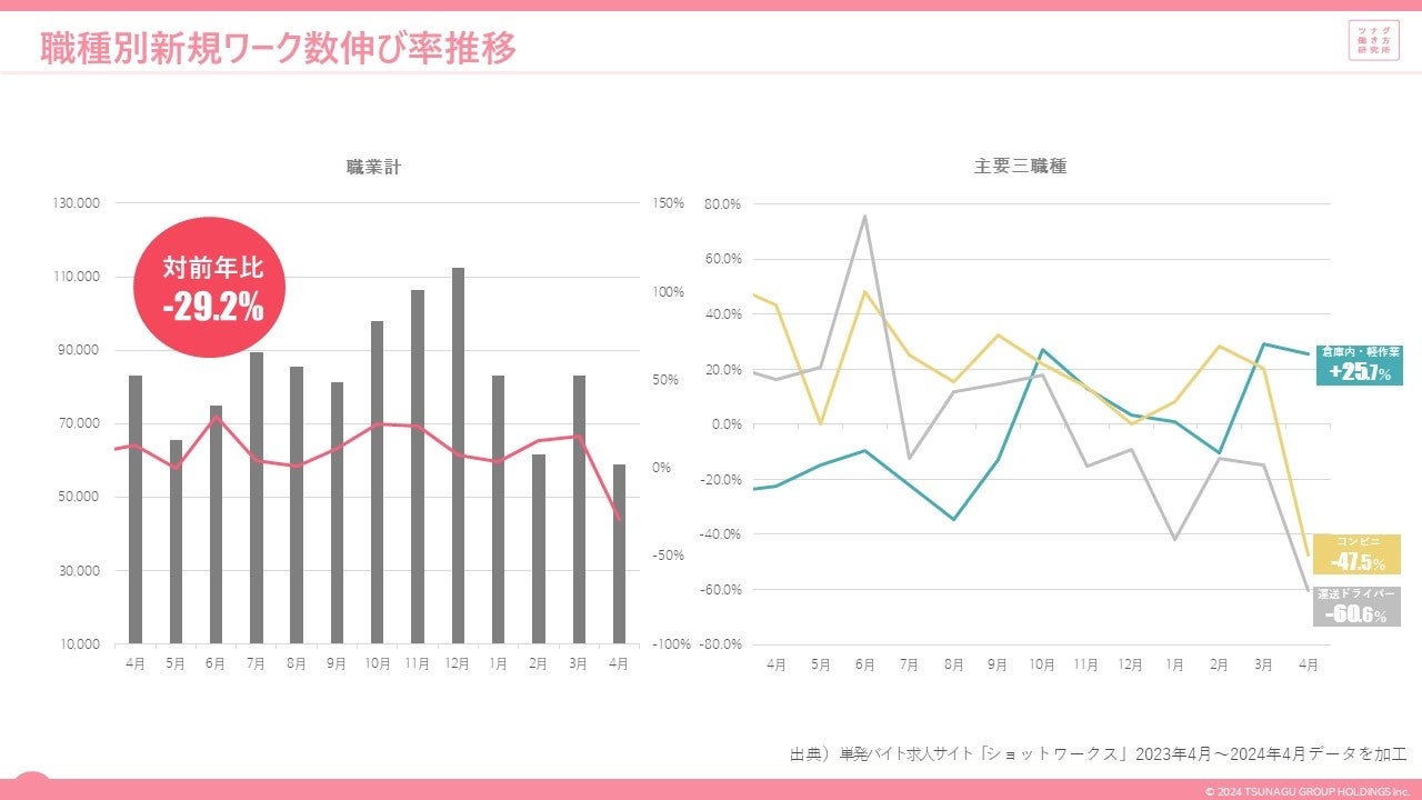 新規ワーク数は、前年比で29.2%減少。主要職種では倉庫内・軽作業が前年比25.7%と増加。