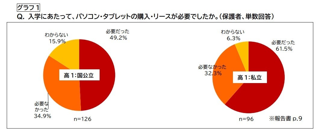 ➢ パソコン・タブレットについて、高 1 は国公立で 49.2%、私立で 61.5%が、購入・リースが必要だったと 回答(グラフ 1)した。その際の補助金・助成金については、「あった」という回答が国公立で 41.9%、私立 で1.7%のみであった(グラフ 2)。