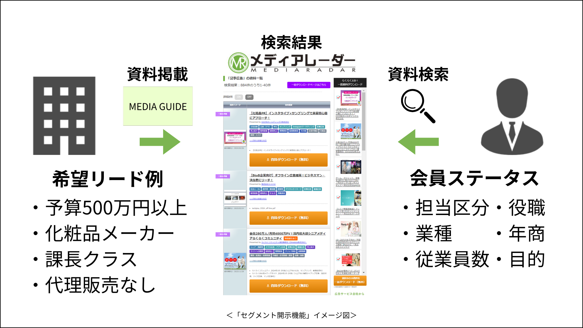上記を応用し、特許を取得した「セグメント開示機能」の技術は、資料ダウンロードの目的に限定せず役職・業種・年商といった各ステータスによって資料の検索結果での掲載順位を変動させることで、掲載社の見込み顧客獲得の質をさらに向上することを目的としています。