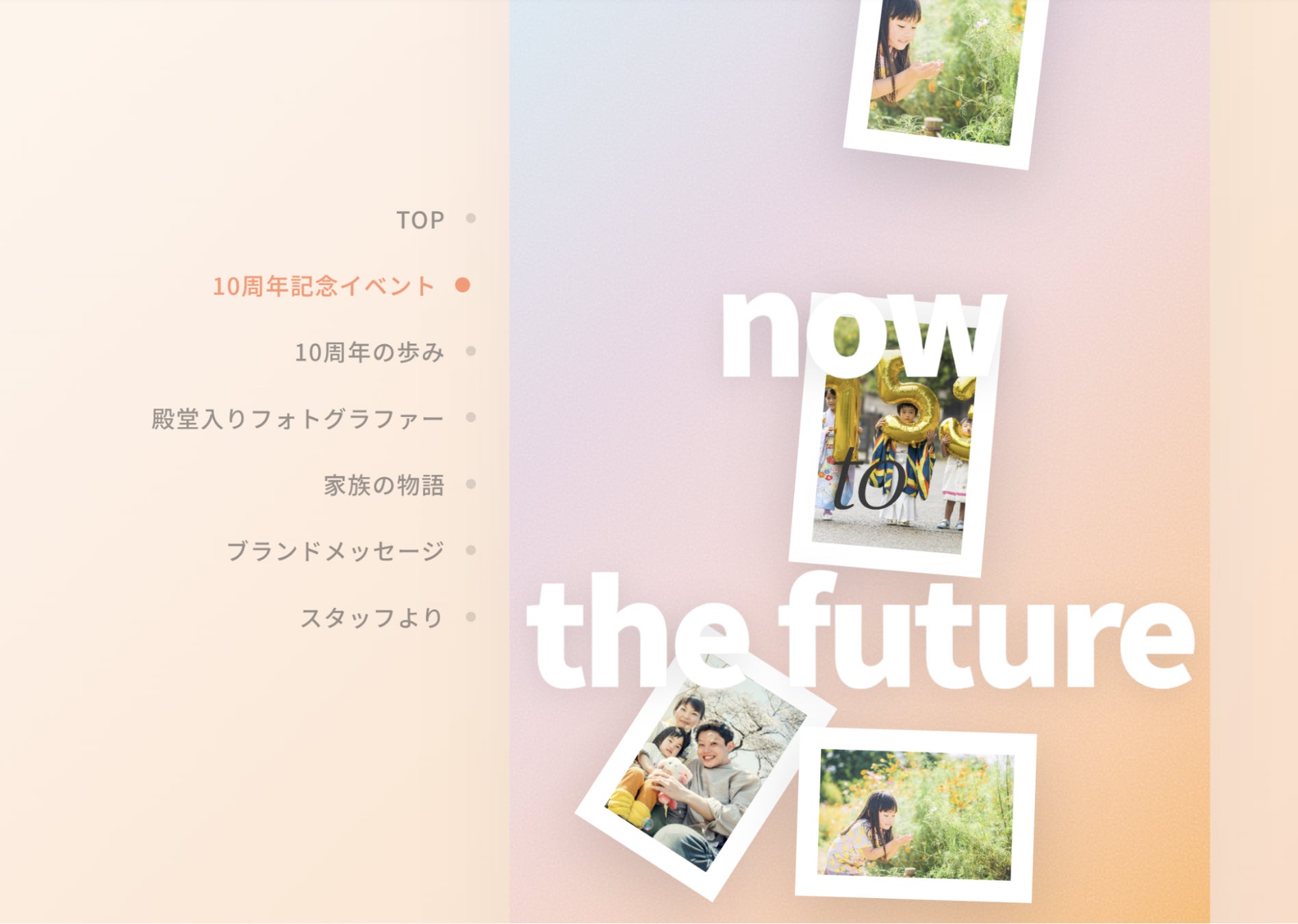 「今を、未来に」というテーマのもと、累計17万件を超える撮影実績とともに、ご家族とフォトグラファーが共に紡いできたエピソードやfotowaスタッフの声を紹介しています。