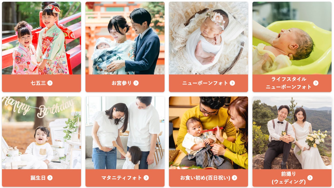マタニティ、ニューボーン(新生児)、お宮参り、誕生日、七五三、卒入園・卒入学、成人式、結婚式の前撮り・後撮り、長寿祝いなど、ご家族の記念日はもちろん、日々の残したい愛おしさに寄り添う「わが家の専属フォトグラファー」として、全国のご家族にご利用いただいています。