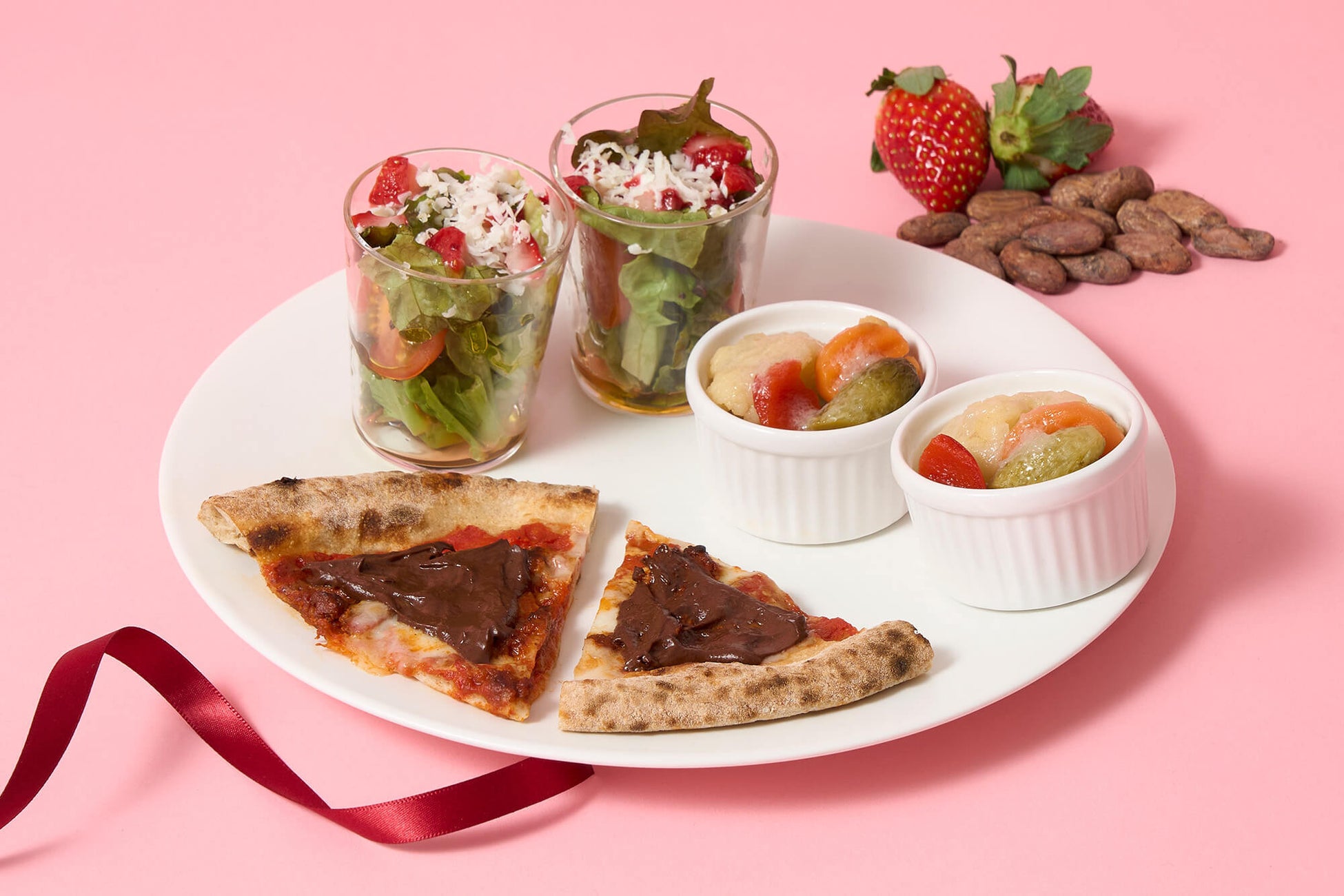 苺をはじめ多彩な素材を使ったスイーツに、ピザなどのセイボリーも並ぶ、満足感たっぷりのメニューです。さらにスペシャルデザートには、8層仕立てのチョコレートオペラを、苺やチョコレートアイスとともに仕立てています。