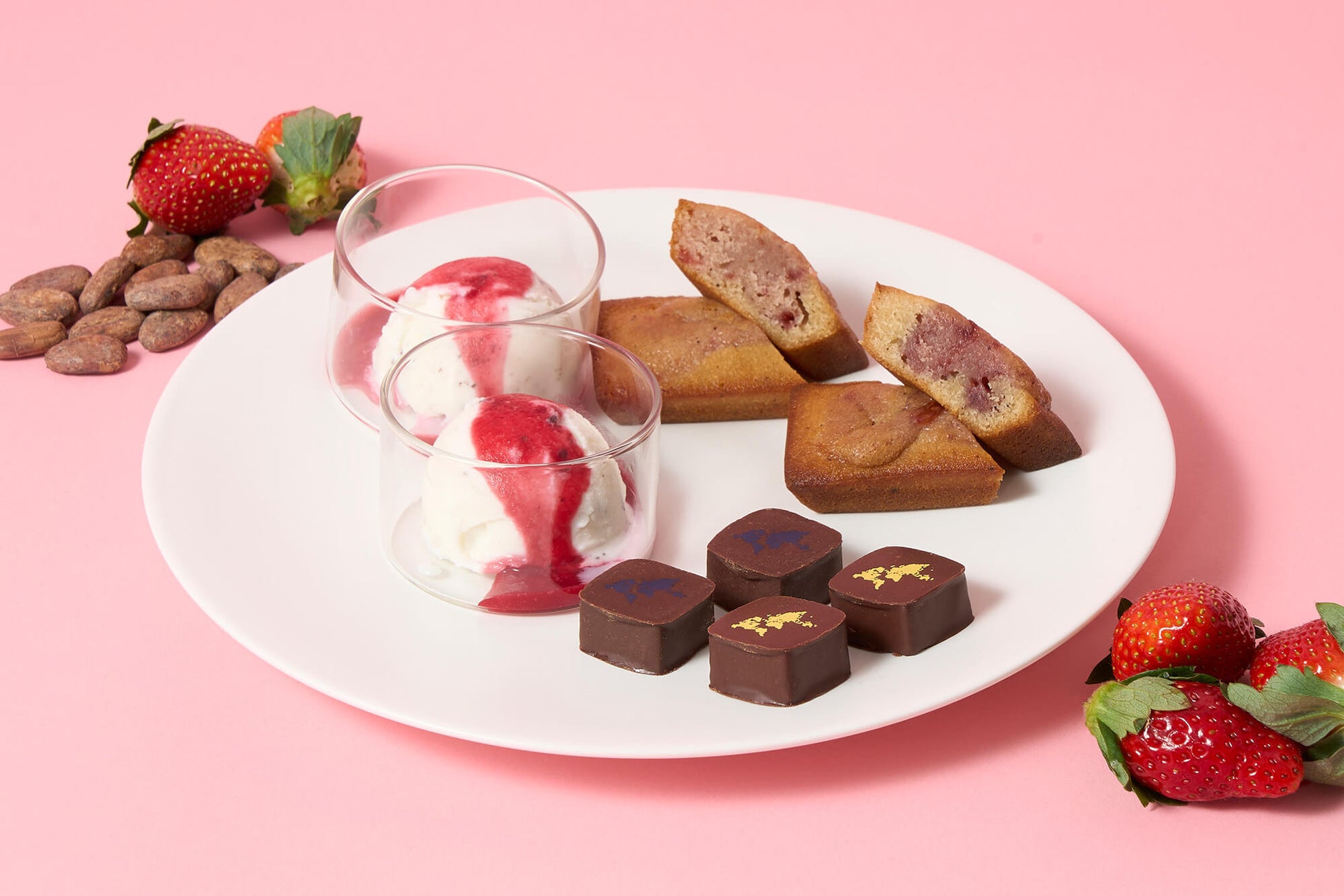 お皿には、同じくガーナ産カカオ由来の甘いスパイス感をまとった芳醇なチョコレートアイスと、コクのあるまろやかなアーモンドアイスを添えました。さらに苺や甘酸っぱいフランボワーズ、キャラメルのような甘みをもつブロンドチョコレートやホワイトチョコレートを組み合わせ、ひと口ごとに広がる豊かなハーモニーをお楽しみいただけます。