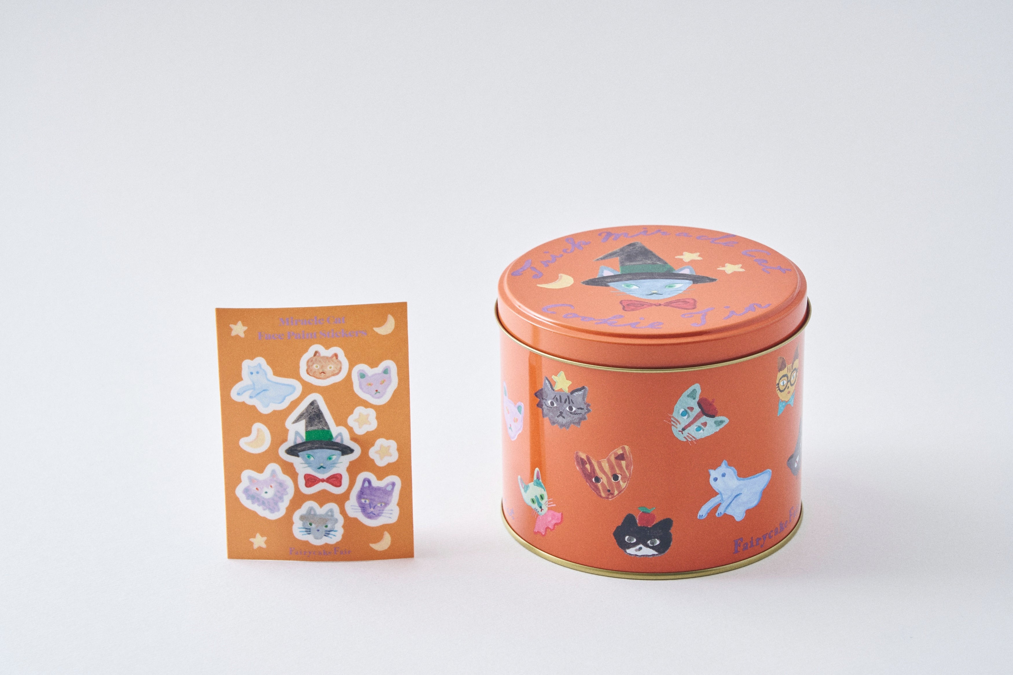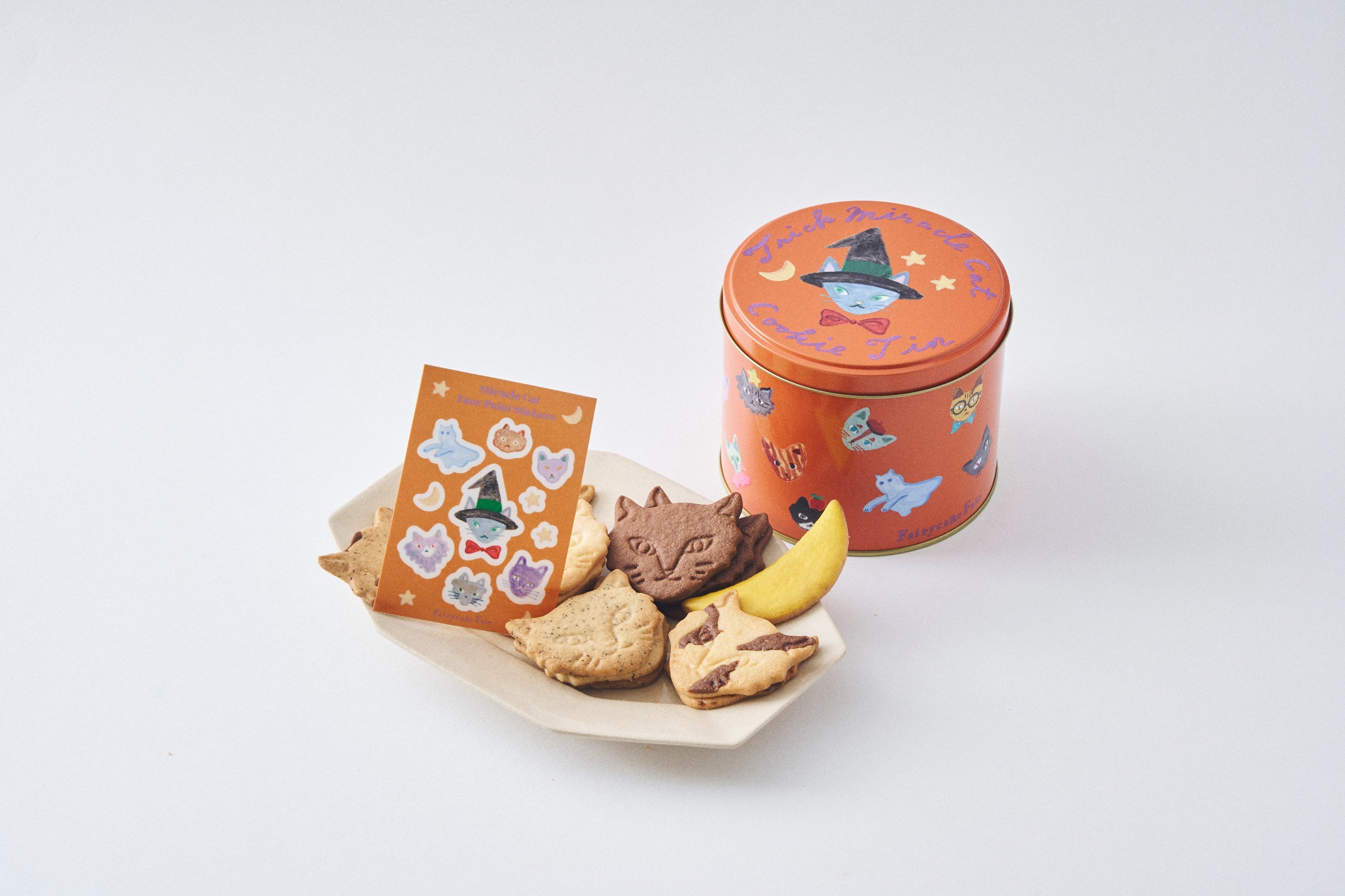 フェアリーケーキフェアと、ミュージシャン・坂本美雨さん、イラストレーター・前田ひさえさんがタッグを組んで誕生した「“神様のいたずら”ネコクッキー缶」に、今年はハロウィン限定バージョンが仲間入り!新色ハロウィンカラーのクッキー缶に、定番のネコクッキー5種と、今だけの三日月クッキーを組み合わせ。さらに、ハロウィンを盛り上げる「フェイスシール」も新登場。秋のイベントをより楽しくする、遊び心とおいしさが詰まった特別限定アイテムが揃います。