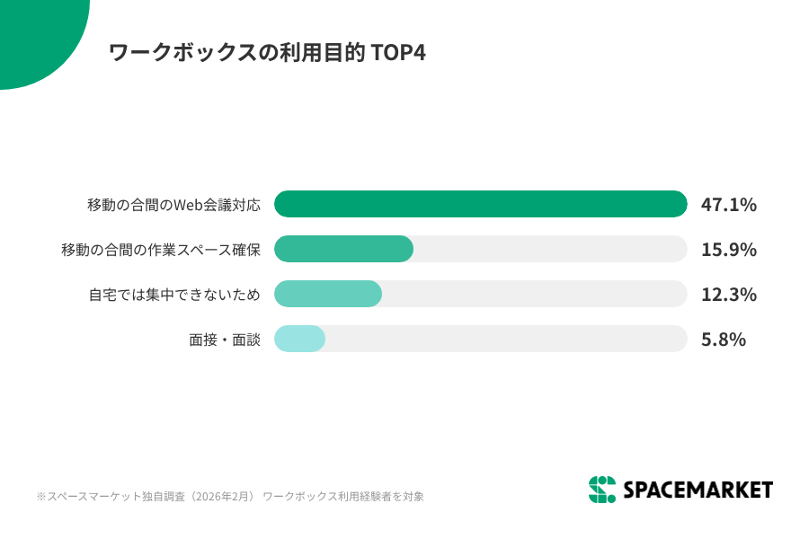 利用目的の47.1%が「移動時間の間にWeb会議が入り、オンラインで話せる場所が必要だった」と回答。外出先や移動中に、周囲の目を気にせず安定した通信環境でWeb会議や商談を行うセーフティネットとして機能していることがわかりました。また「移動の合間」需要以外にも、自宅に家族がいて集中できない場合(12.3%)や、採用面接・転職面談など秘匿性が高い用途(5.8%)での利用も確認されています。
