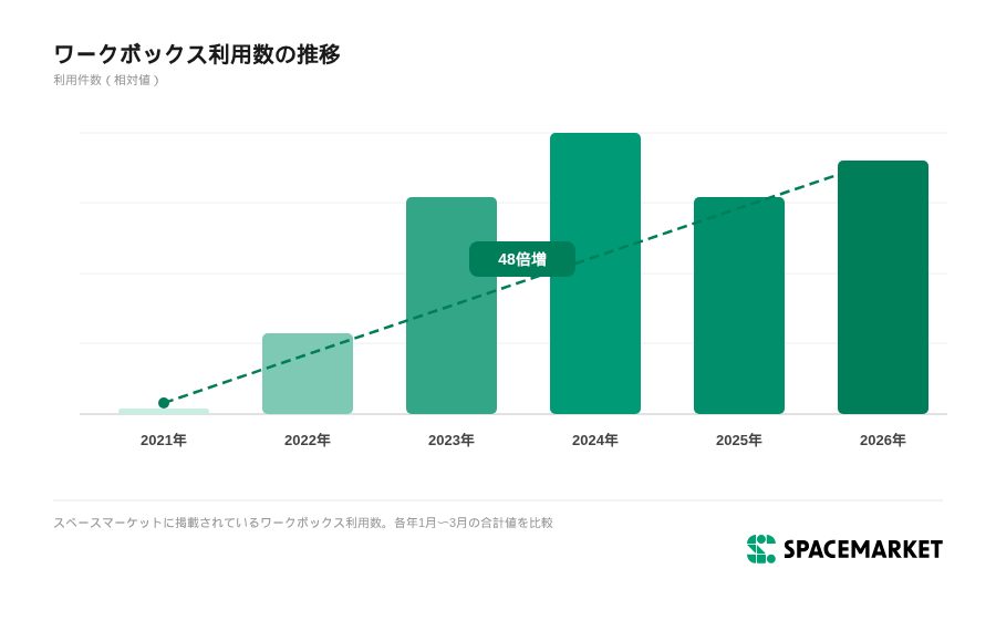 (※1)スペースマーケットに掲載されているワークボックス利用数、2021年1月〜3月と2026年1月〜3月の合計値比較データ。