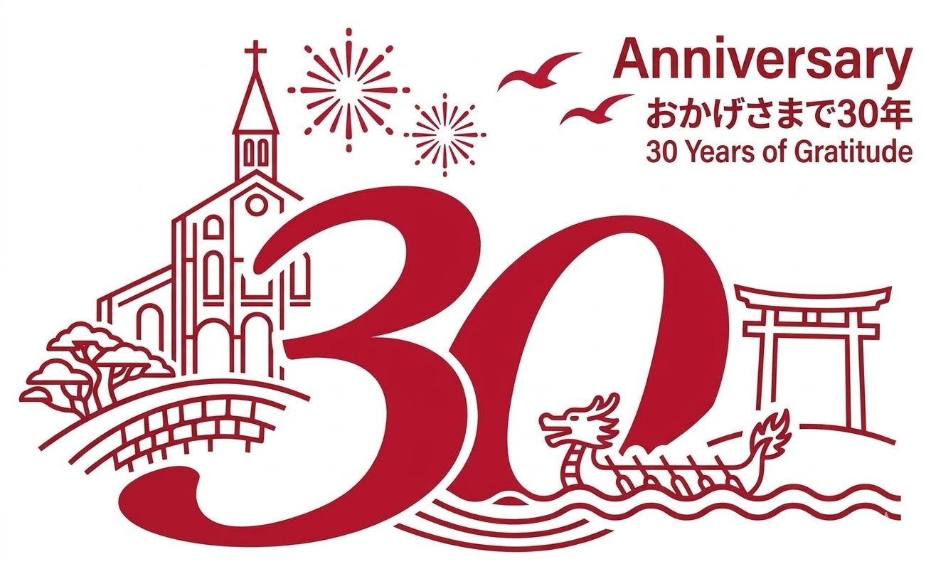 開業30周年記念ロゴには、長崎の伝統行事「ペーロン」をモチーフにした船を中心に、異国文化が交わる街を象徴する教会や鳥居、そして夜空に咲く花火を描いています。