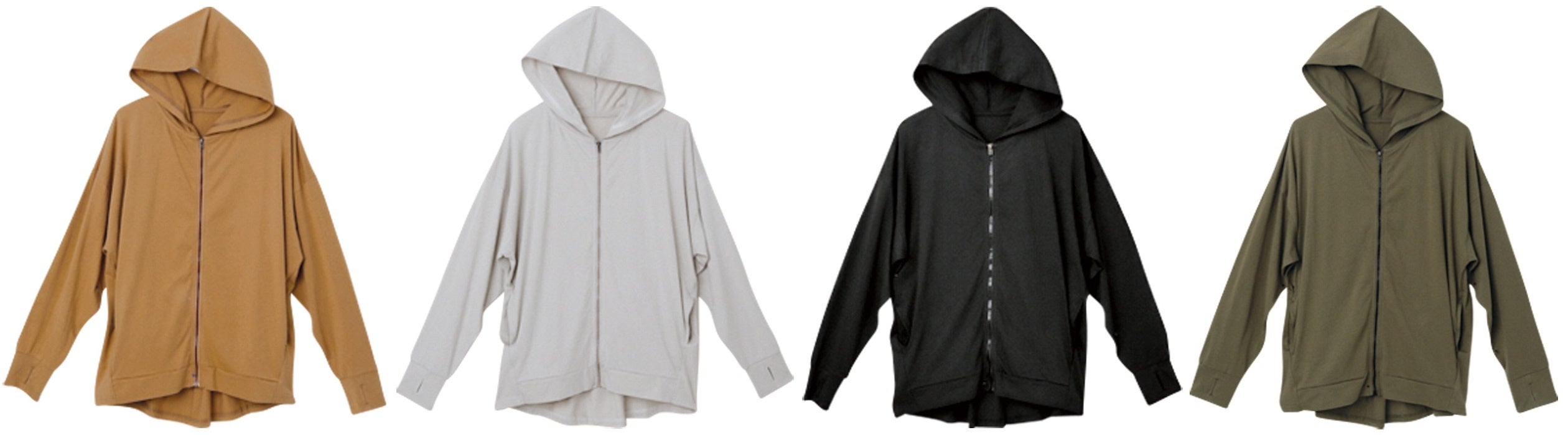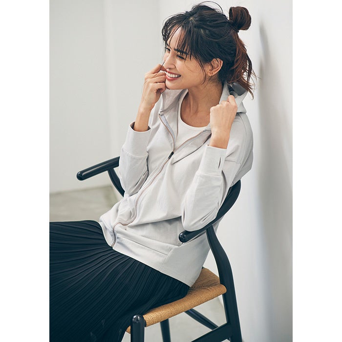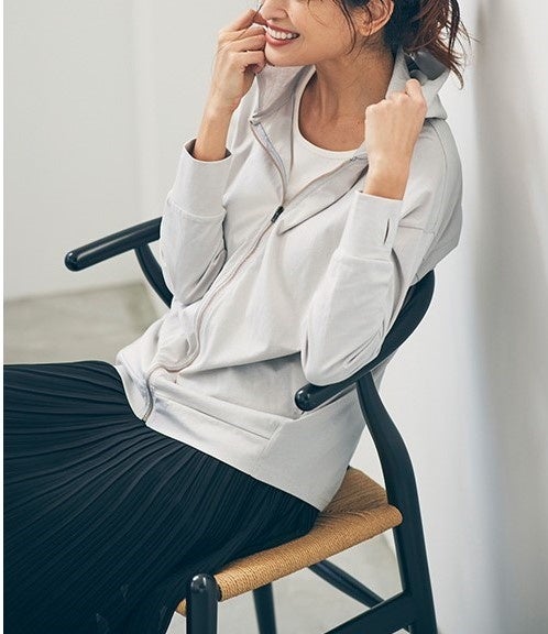 ■特長:綿100%の「Beautiful Cotton」を使用した接触冷感・UVカット機能付きのパーカー。手の甲までカバーができる指穴付きのデザインが印象的。こなれ感を演出するニュアンスカラー展開も魅力です。