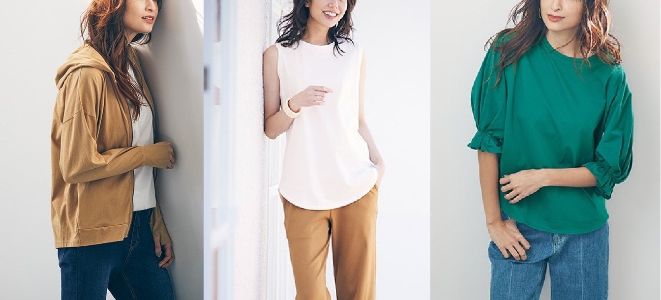 今回は、人気の「Beautiful Cotton」シリーズより新登場した商品をピックアップ。インナーはもちろん1枚着としても着用できる「UVカットロング丈タンクトップ」、パフ状に仕上げた袖がポイントの「UVカットパフ袖プルオーバー」、手の甲までカバーが可能な「UVカット指穴付ゆるシルエットパーカー」の3商品です。