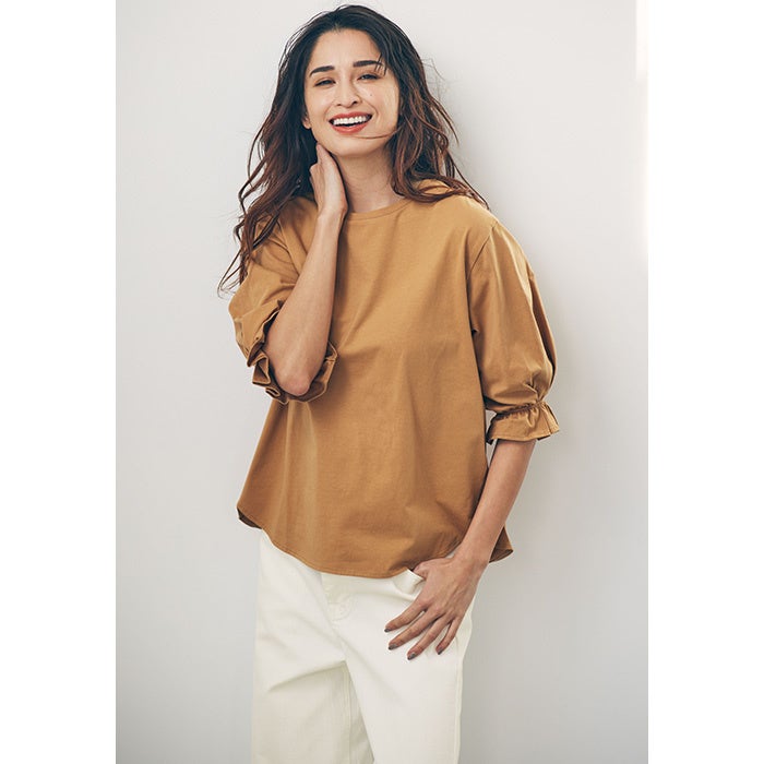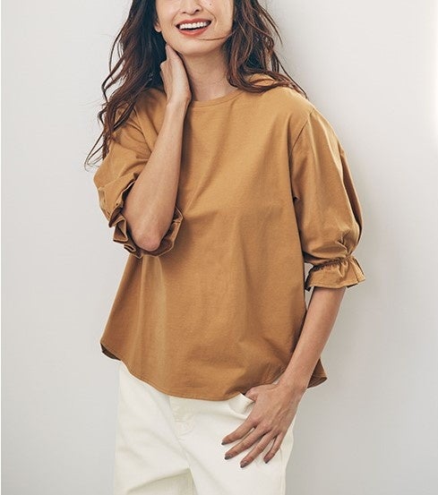 ■特長:綿100%の「Beautiful Cotton」を使用した接触冷感・UVカット機能付きの5分袖のプルオーバー。着るだけでコーディネートが映える、パフ状の袖が特長の一枚。この夏重宝間違いなしのアイテムです。