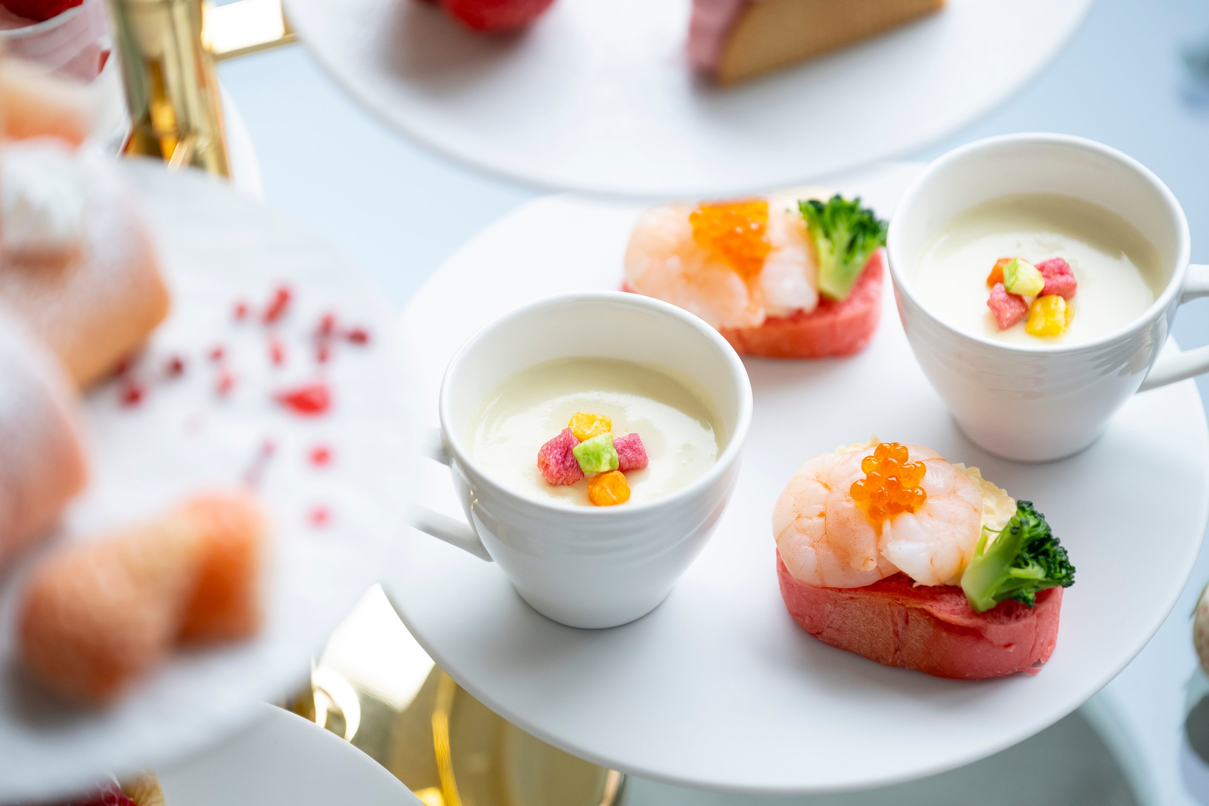 今回から、シンプルで洗練されたデザインで素材が引き立つアフタヌーンティースタンドを採用。スタンドには6枚の中皿が乗り、1枚1枚のお皿を左右に動かすことや手に取ることができるため、より写真が撮りやすく、また食べやすくなりました。