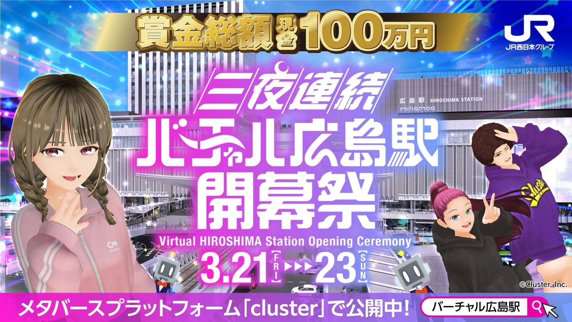 イベント累計動員数3,500万人を超える、国内最大級のメタバースプラットフォーム「cluster」を運営するクラスター株式会社(本社:東京都品川区、代表取締役CEO:加藤直⼈、以下「クラスター」)は、西日本旅客鉄道株式会社(本社:大阪市北区、代表取締役社長:長谷川 一明)、株式会社JR西日本コミュニケーションズ(本社:大阪市北区、代表取締役社長:伊藤 義彦)、株式会社JR西日本イノベーションズ(本社:大阪市北区、代表取締役社長:川本 亮)と協力し、提供するメタバースプラットフォーム「cluster」において、2025年3月17日(月)より期間限定でリアルの広島新駅ビル「ミナモア」を再現・拡張したバーチャル・ステーション「バーチャル広島駅」がオープンしたことをお知らせいたします。