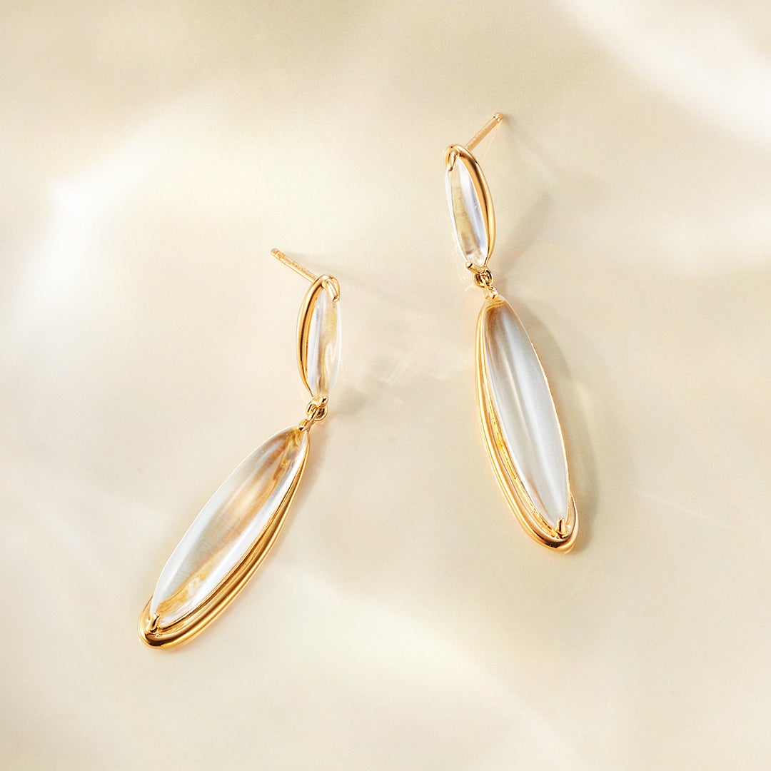 主役級の存在感を放つ全長55cmのラリエットネックレスは、重ね付けにもおすすめです。滑らかで優しい地金のラインにクリアなクォーツが留められた、モダンな印象のピアスもご用意いたしました。クォーツやトパーズが地金に沿って一続きで流れるようなリングセットは、曲線のラインがぴったり寄り添う美しいデザインで、手元に馴染み寄り添うアクアゴールドカラーに包まれ、上品かつ軽やかな雰囲気をプラスしてくれます。