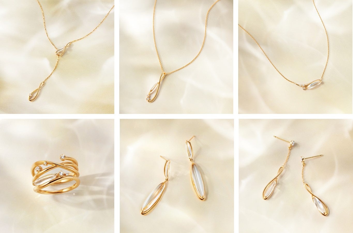 幸福の1滴が流れ落ち、巡り繋がってゆく様子を「Canal 4℃」らしい曲線美でインフィニティラインに象ったジュエリーが登場。滑らかな地金のラインに寄り添うように、「純粋」の石言葉を持つクォーツと、「幸運」、「希望」の意味を持つトパーズを留めました。4℃オリジナルカラーの「4℃アクアゴールド」が放つ穏やかなゴールドカラーのラインと、ストーンの柔らかでクリアな光が、絶え間なく続いていく運河のように流れる水の動きを思わせるデザインです。